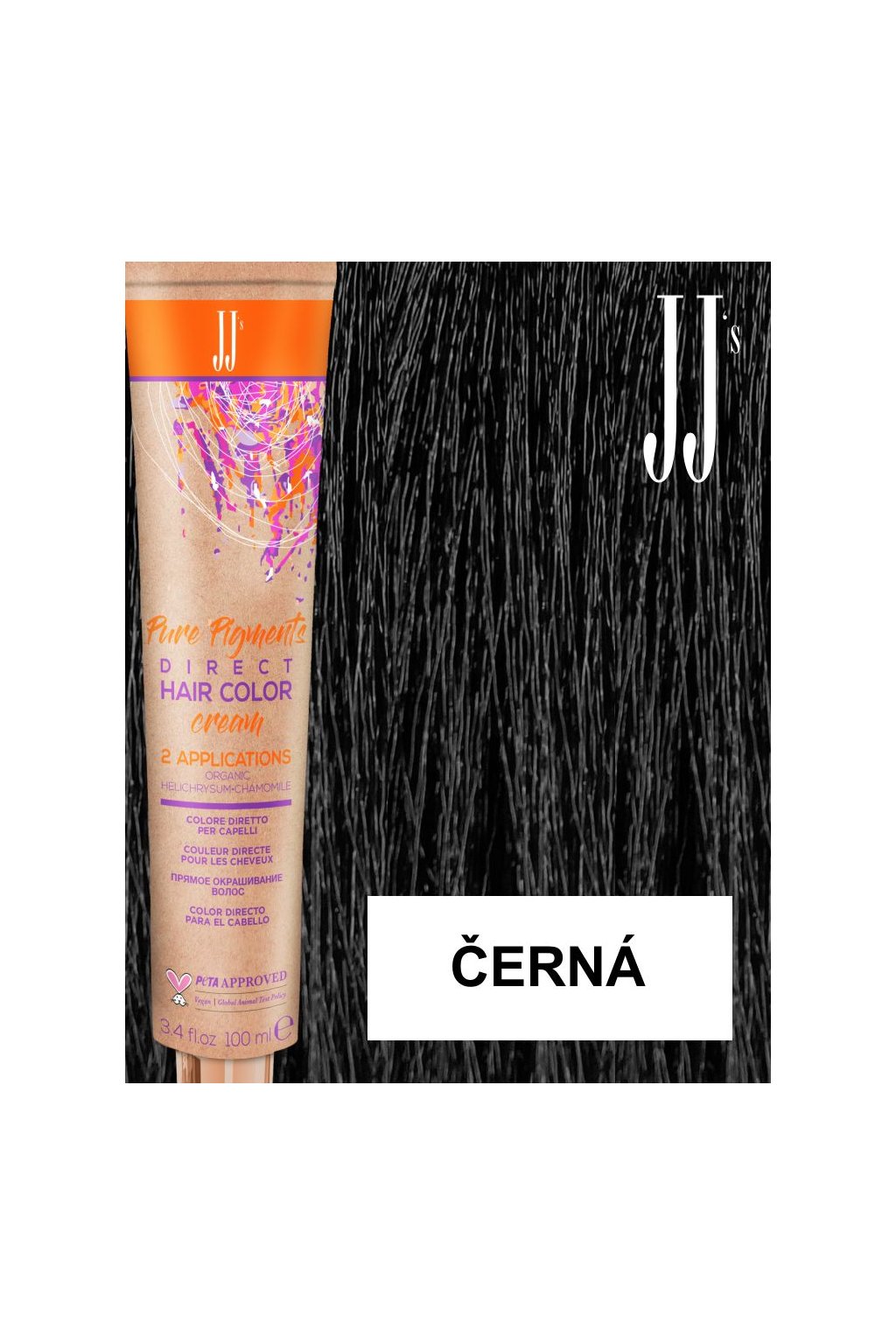 JJ PURE PIGMENTS DIRECT COLOR - PŘÍMÁ BARVA S ČISTÝMI PIGMENTY. Polopermanentní barva bez amoniaku. Její kosmetické krémové složení bez oxidantu umožňuje získat nekonečnou rozmanitost barev s krátkou dobou působení. Výsledkem je rozzářená, jednotná barva od kořínků ke konečkům s dlouhotrvajícím účinkem. Pro získání rozzářených a živých barev je nutné odbarvit, stupeň 7-8 nebo 9-10 podle barvy, která má být aplikována a podle výchozí barvy vlasů. Certifikát PETA APPROVED VEGAN netestované na zvířatech, s biologickými složkami, eco-friendly a plastic free filozofií.