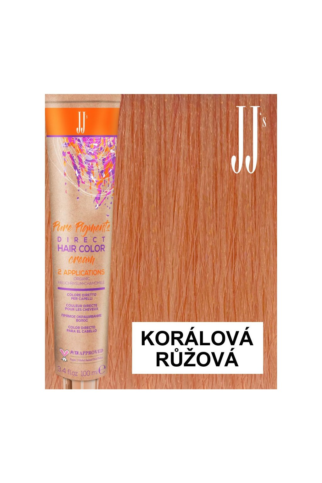 JJ PURE PIGMENTS DIRECT COLOR - PŘÍMÁ BARVA S ČISTÝMI PIGMENTY. Polopermanentní barva bez amoniaku. Její kosmetické krémové složení bez oxidantu umožňuje získat nekonečnou rozmanitost barev s krátkou dobou působení. Výsledkem je rozzářená, jednotná barva od kořínků ke konečkům s dlouhotrvajícím účinkem. Pro získání rozzářených a živých barev je nutné odbarvit, stupeň 7-8 nebo 9-10 podle barvy, která má být aplikována a podle výchozí barvy vlasů. Certifikát PETA APPROVED VEGAN netestované na zvířatech, s biologickými složkami, eco-friendly a plastic free filozofií.