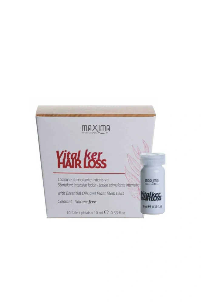 Maxima VITAL KER HAIR LOSS - Intenzivní ošetřující vlasová voda s exkluzivním koncentrátem složek přírodního původu, který zajišťuje vitalitu vlasové pokožky a stimuluje k růstu zdravých vlasů. Obsahuje vzácné esenciální oleje s dezinfekčními, posilujícími a zklidňujícími účinky. Díky společnému působení s rostlinnými kmenovými buňkami stimuluje a obnovuje vlasový růst. Vitamínový B komplex (B3, B5 a B6) zlepšuje mikrocirkulaci krve ve vlasové pokožce. Účinné složení s omezeným obsahem rostlinného alkoholu. Bez parabenů, silikonů a barviv. Tonikum intenzivně prokrvuje, proto může docházet k pocitu prohřátí pokožky. Upozornění: aplikujte pouze na vlasovou pokožku, při stečení nebo kápnutí na tvář, krk, ostatní pleť, opláchněte vlažnou vodou, může dojít k zarudnutí či nepříjemným pocitům, které však postupně odezní.